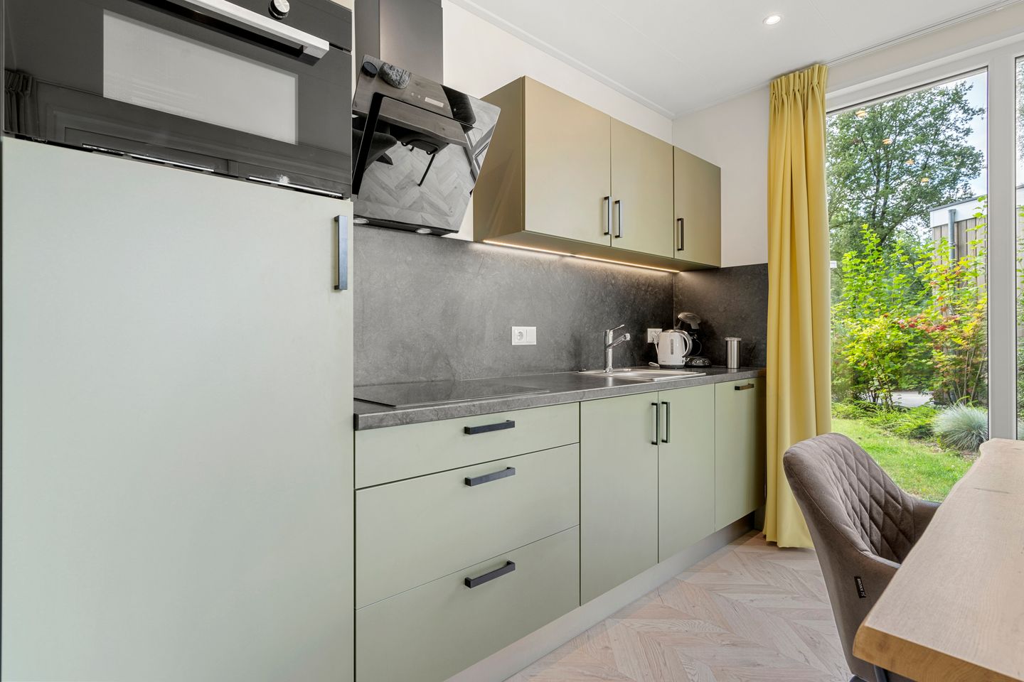 Aangrenzend aan de woonkamer bevindt zich de ruime, open keuken. Deze is uitgerust met diverse inbouwapparatuur, waaronder een koelkast, kookplaat, afzuigkap, combi-oven en vaatwasser. De dubbele openslaande deuren in de keuken zorgen voor een naadloze verbinding tussen binnen en buiten, wat bijdraagt aan het vrije en natuurlijke woongevoel.