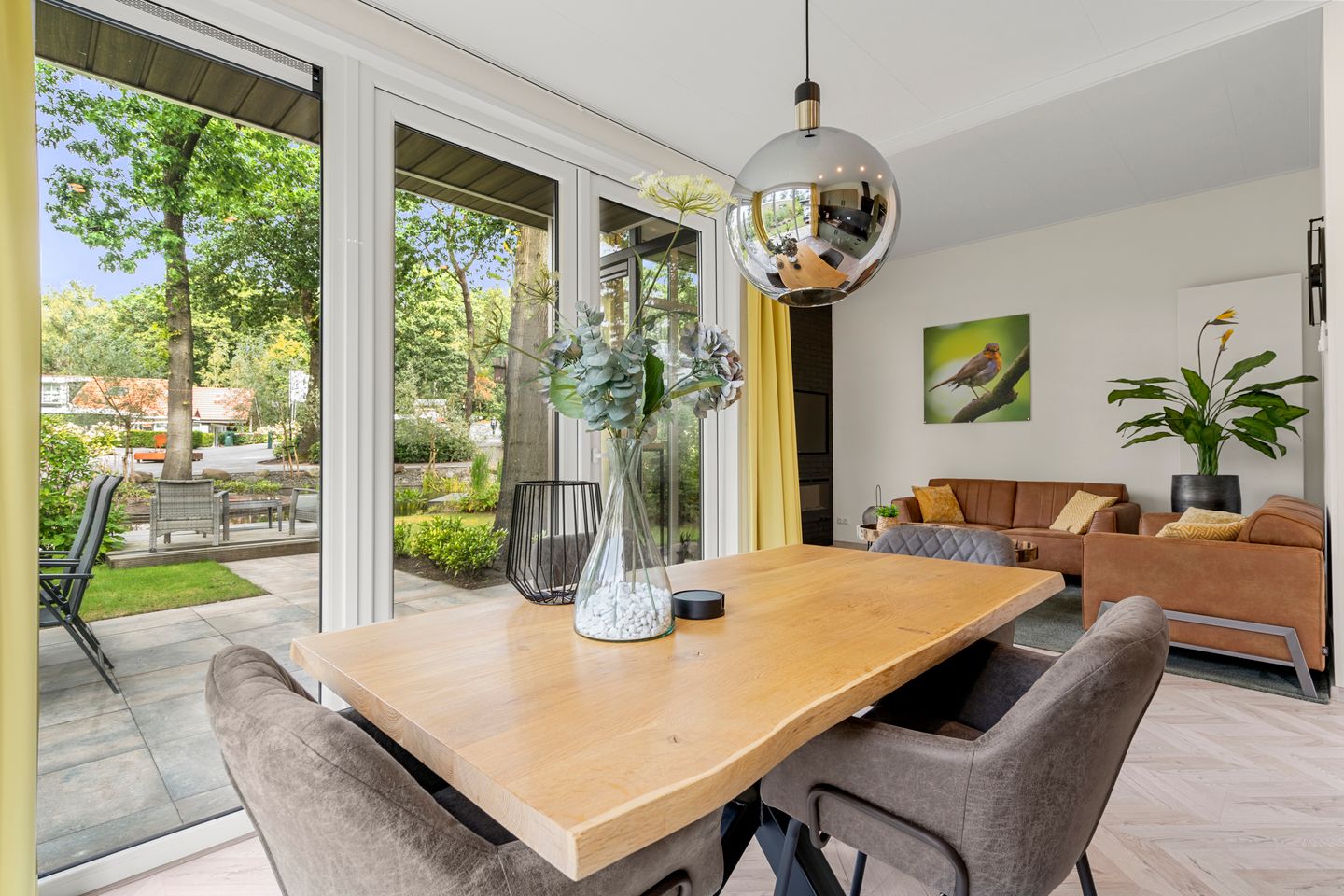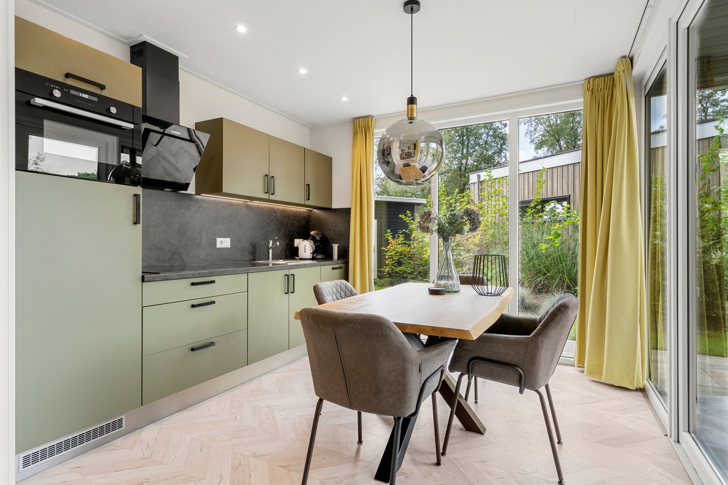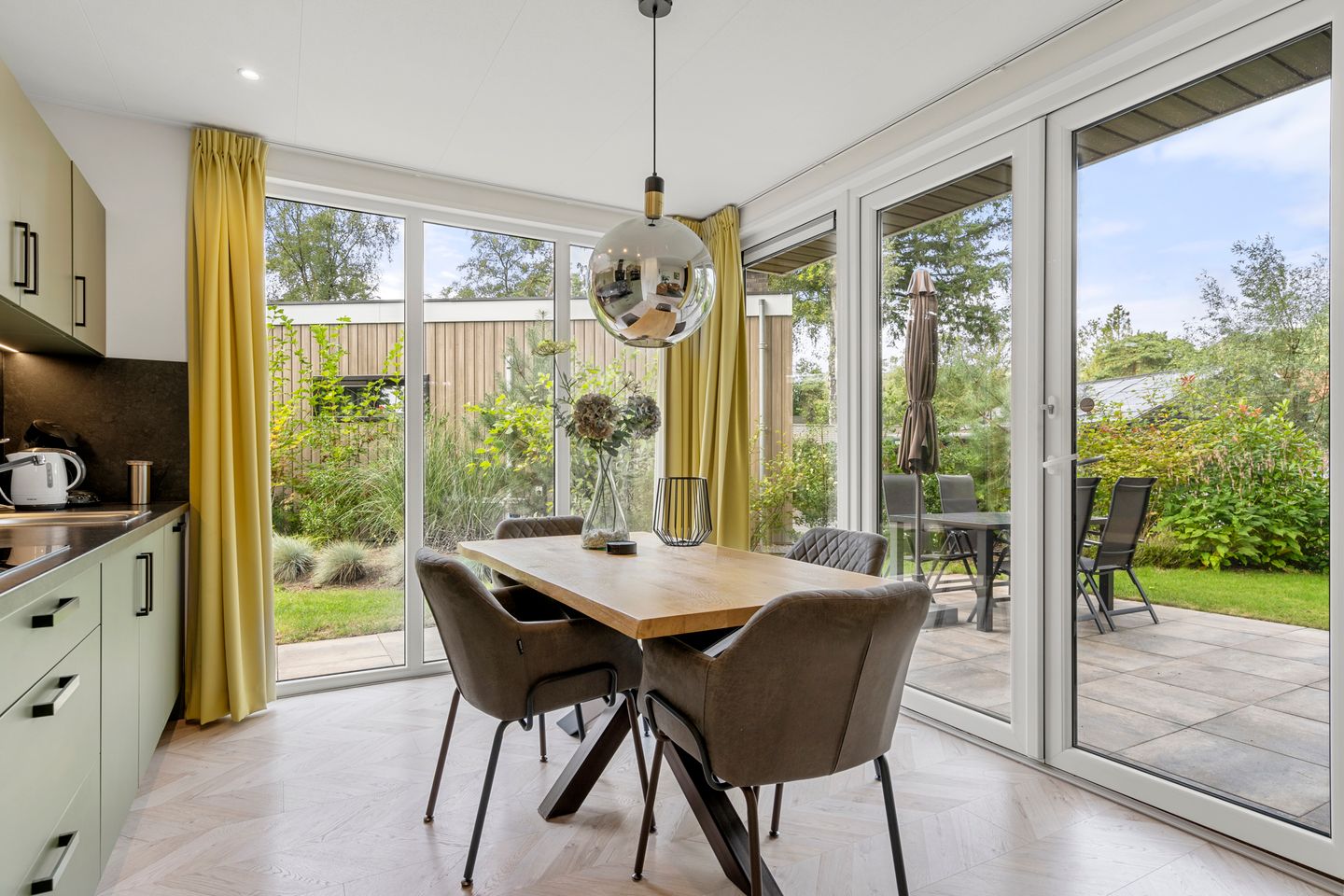 Aangrenzend aan de woonkamer bevindt zich de ruime, open keuken. Deze is uitgerust met diverse inbouwapparatuur, waaronder een koelkast, kookplaat, afzuigkap, combi-oven en vaatwasser. De dubbele openslaande deuren in de keuken zorgen voor een naadloze verbinding tussen binnen en buiten, wat bijdraagt aan het vrije en natuurlijke woongevoel.