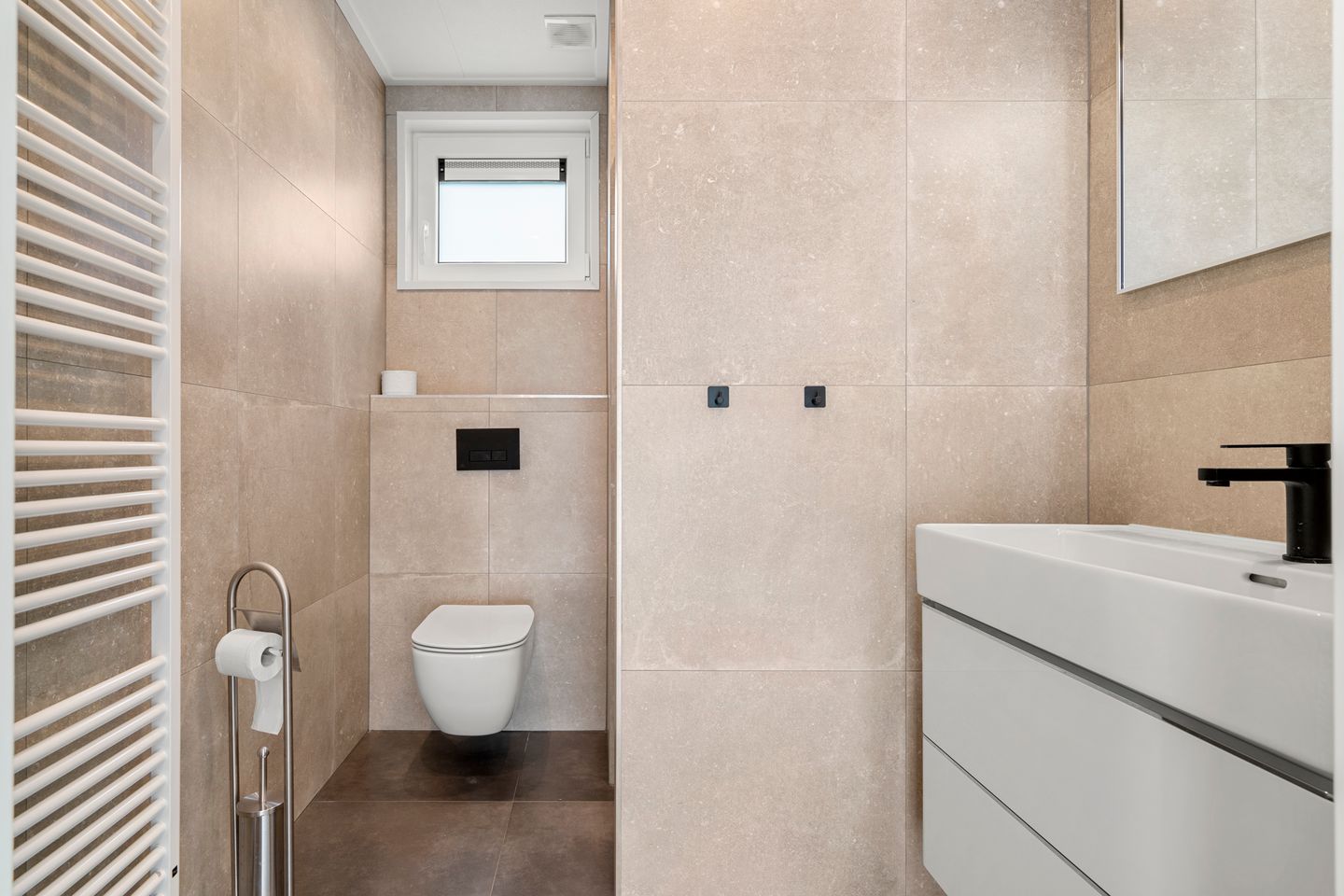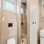 De lichte badkamer is voorzien van een toilet, wastafel en douche. De ruimte is efficiënt ingedeeld en netjes onderhouden.