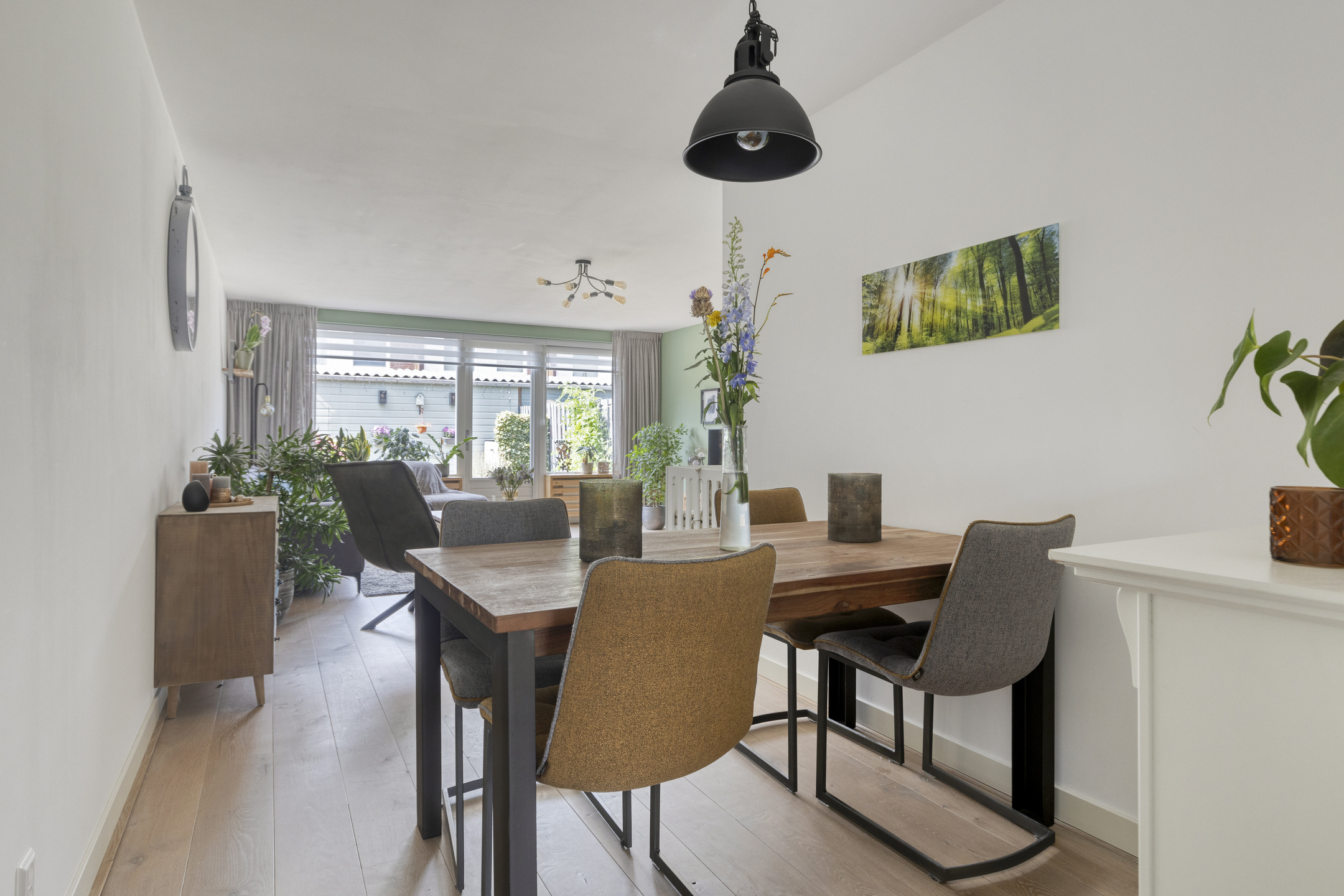 Entree/hal met de meterkast, een toiletruimte en een handige trapkast. De lichte woonkamer (5.61x4.79m) is uitgebouwd en kijkt uit op de tuin. De open keuken aan de voorkant is een echte eyecatcher en van alle gemakken voorzien van diverse Siemens inbouwapparatuur, zoals een inductiekookplaat, afzuigkap, vaatwasser, koel/vriescombinatie, oven en combimagnetron. Doordat de keuken aan de voorzijde is gesitueerd heb je goed contact met de eetkamer die tussen de woonkamer en de keuken ligt.